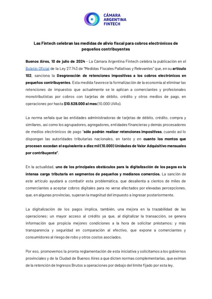 La Cámara Argentina Fintech celebra la publicación en el Boletín Oficial de la Ley 27.743 de “Medidas Fiscales Paliativas y Relevantes” que, en su artículo 102, sanciona la Desgravación de retenciones impositivas a los cobros electrónicos en pequeños contribuyentes. Esta medida favorece la formalización de la economía al eliminar las retenciones de impuestos que actualmente […]